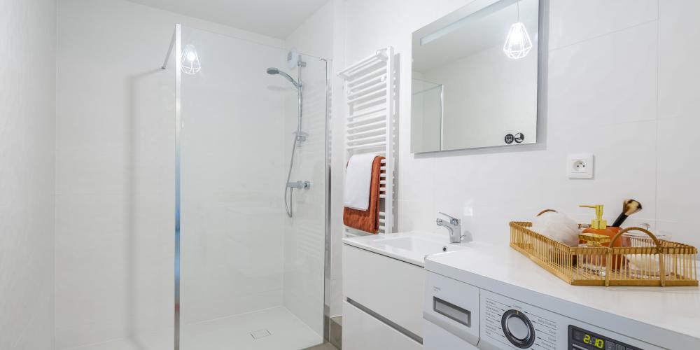 - Salle de bains équipée : meuble vasque, miroir et radiateur sèche-serviettes